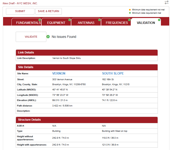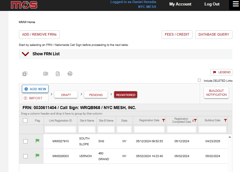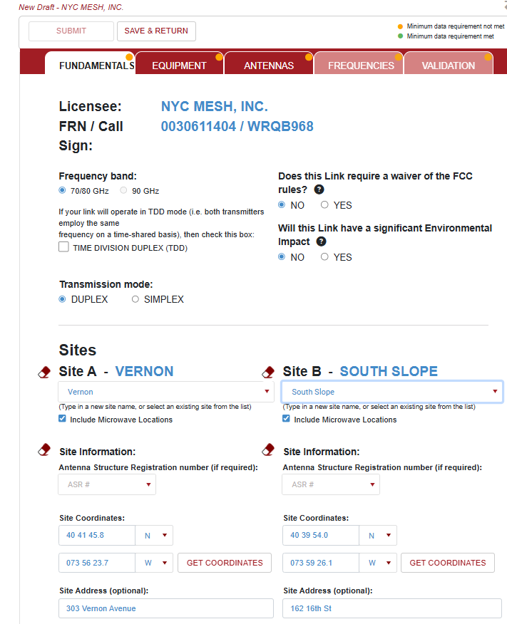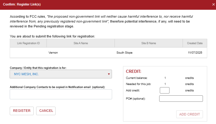 Our Siklu EH-8010FX 10Gbps radios fall in this classification and is required to be registered with the FCC's Link Registration System through a "Database Manager", which costs $75 per link to register. NYC Mesh uses Micronet Communications and had selected this vendor only based on the ease of which their platform operates.