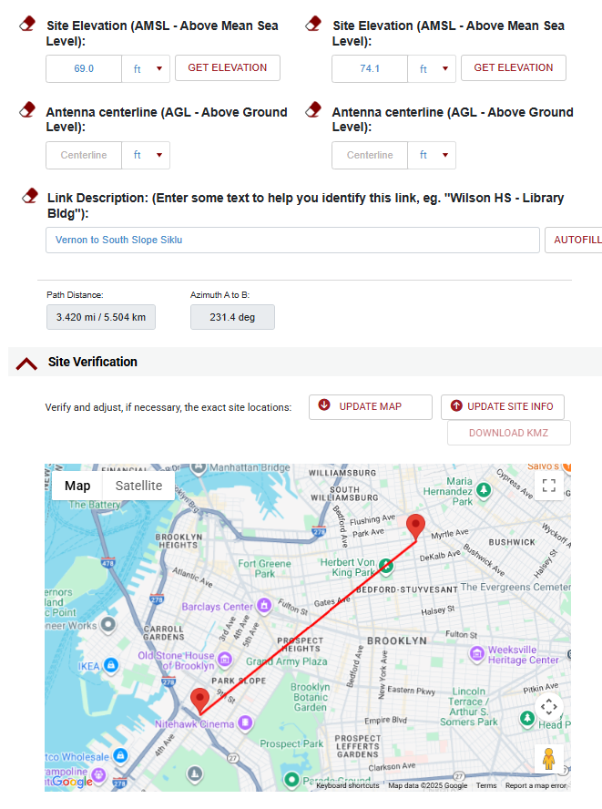 For Site Elevation, click on "GET ELEVATION" to automatically get the value that Micronet has on file for the address. For Antenna centerline, use the exact height of the antenna compiled earlier.