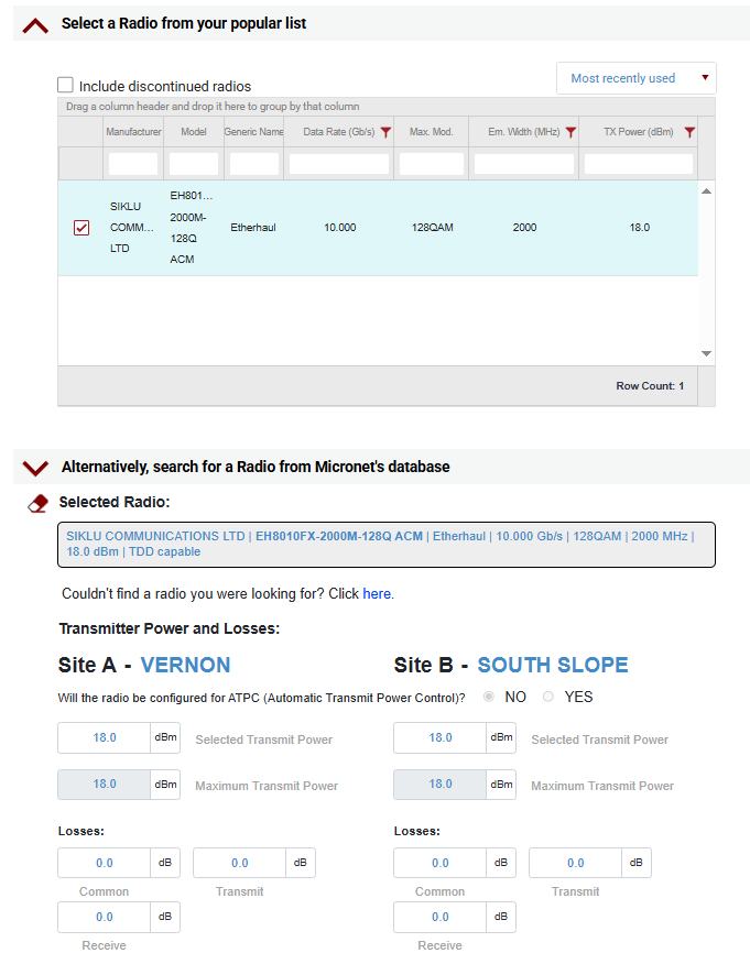 If you are installing the same usual Siklu EH-8010FX like our other sites, you can select this combination of configuration from our previously- used list which will populate all the values. Otherwise, you can find the model of antenna and enter in the details manually from its datasheet.