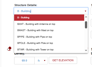 For Structure Details, refer to your notes on how the antenna is mounted on each side of the link to select the option that best fits the installation. For antennas that are mounted to a mast on the side of the building, B - Building should be acceptable. If the mast goes above the roofline of the building, the other options may fit the description more accurately.