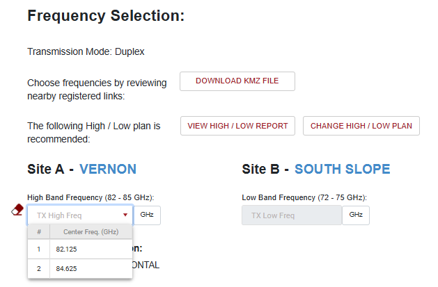 To enter the frequencies, open the Siklu dashboard to ensure that you are using the correct parameters for the registration that will be applied to the radios. If the High Band and Low Band Frequencies do not correspond with the antennas that are at each site, click on "Change High / Low Plan".