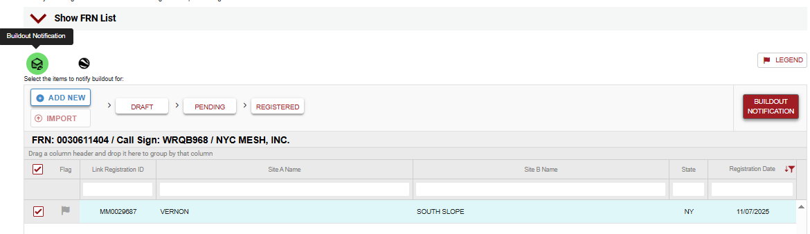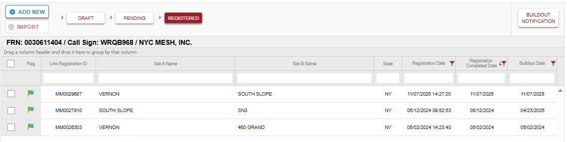 Once the application is approved, when the link is ready to be powered on and put into production, you will need to complete the "Buildout Notification" on the main dashboard to mark the link as installed.