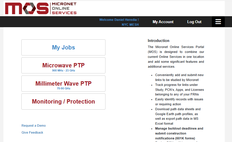 To log into the platform, visit their website https://micronetcom.com/ and click on "MOS LOGIN" on the top-right corner of the page. As of 2025, the credentials are currently set to daniel@nycmesh.net, and you can reach out to @Daniel Heredia on Slack for access.