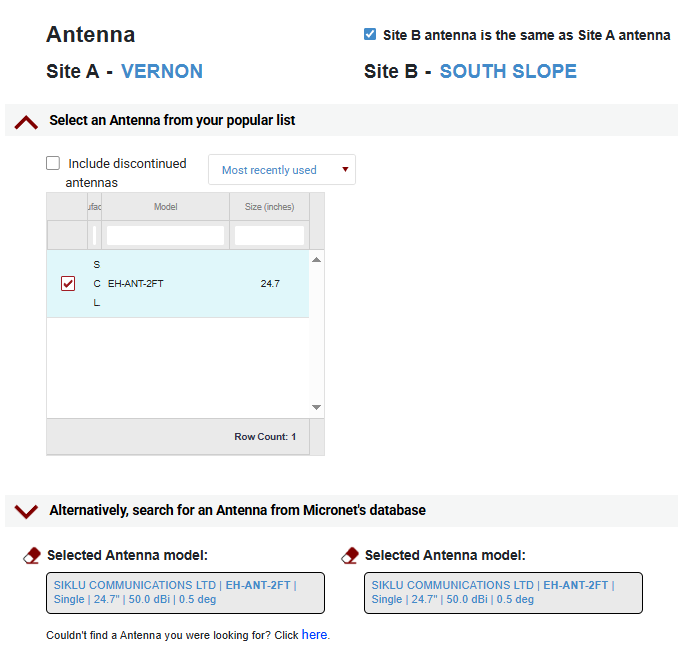 Same applies for the antennas - if the equipment you are installing is the typical 2-foot-wide Siklu antenna, you can select this from our previously used list to populate the information. Otherwise, you can select a compatible antenna from the database.
