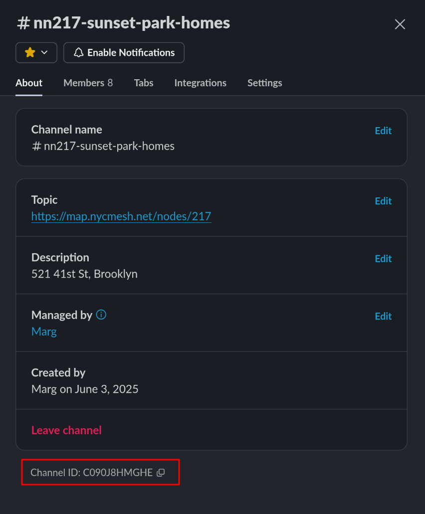3. Add the Node Number of that node, along with the channel ID to https://github.com/nycmeshnet/new-install-notifier/blob/main/channels.json (You will need to clone the repo and submit a PR, or request contributor permissions for the repo to be able to edit the configuration)