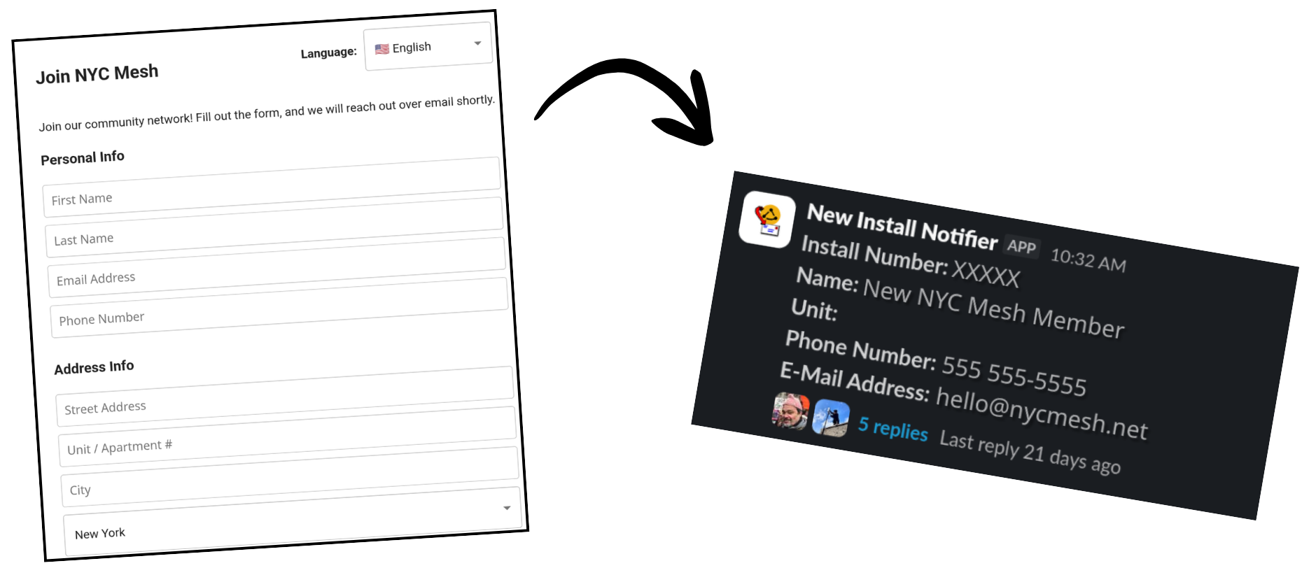 "New Install Notifier is a Slack Bolt app that connects to NYC Mesh's MeshDB via webhook and automatically posts new install requests to designated channels on the NYC Mesh workspace."